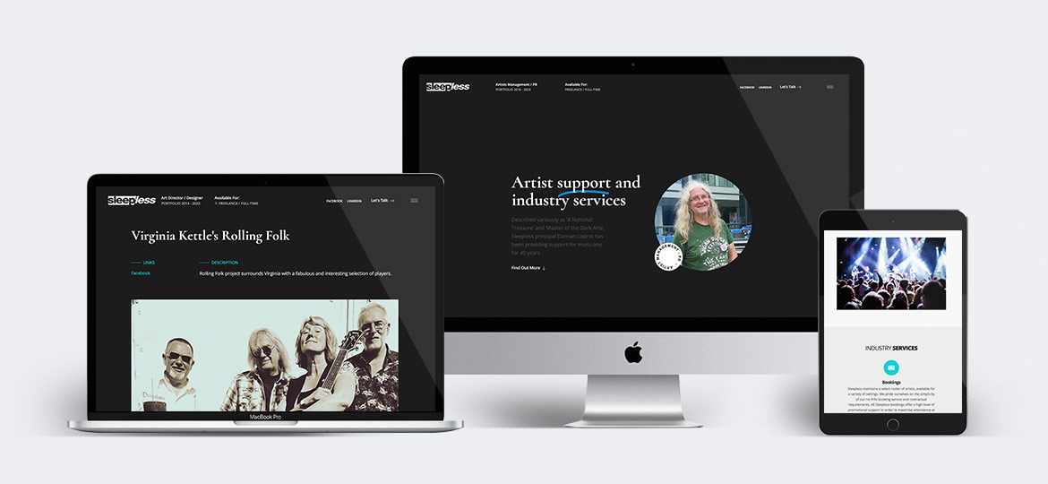 Described variously as ‘A National Treasure’ and ‘Master of the Dark Arts’, Sleepless principal Damian Liptrot has been providing support for musicians for 40 years. As a long time client Damian got in touch to help develop the online presence and some printed material for his music industry PR business.
